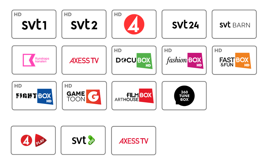 SVT1, SVT2, SVT24, SVT Barn/Kunskapskanalen, TV4, Axess TV, DocuBox, FashionBox, Fast&FunBox, FightBox, GameToon, FilmBox Arthouse och 36o TuneBox. Samt Play-biblioteken SVT Play, TV4 Play och Axess TV.